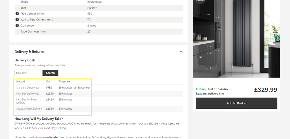 2.) On the product page, under the 'Delivery' tab once you have entered your postcode