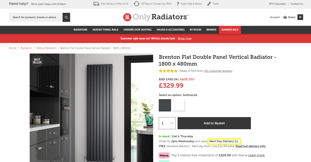 If you order multiple products and they are being delivered together, the delivery size will be the largest from the products chosen. For example, if you order a radiator valve (S) and a large radiator (L), your delivery will be Large (L).